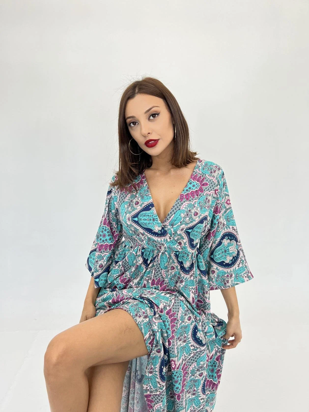 Kadın Kısa Kollu V Yakalı Beli Kuşaklı Ithal Keten Elbise