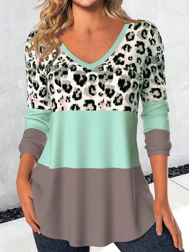 Kadın Uzun Kollu V Yakalı Leopar Baskılı şardonlu Dalgıç Bluz