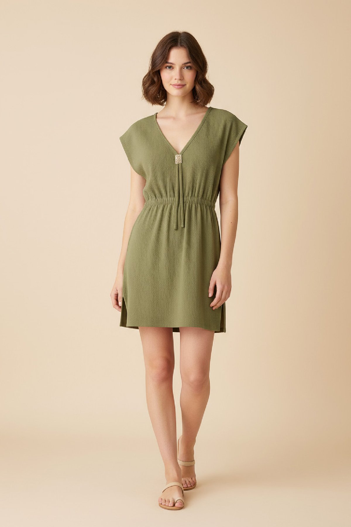 Kadın çan Dokuma Kumaş V Yaka Asimetrik Kesim Elbise