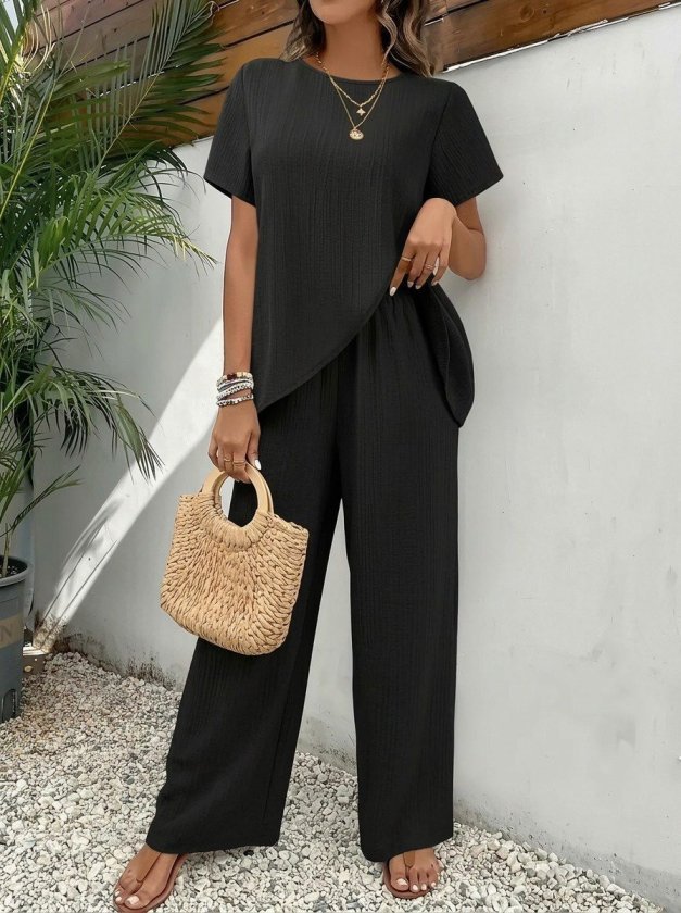 Kadın Kısa Kollu Bisiklet Yaka Asimetrik Viskon Iki Iplik Bluz Ve Pantolon Ikili Takım