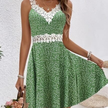 Kadın Askılı Yuvarlak Yakalı Yaprak Desenli Dalgıç Elbise
