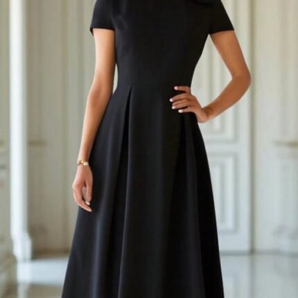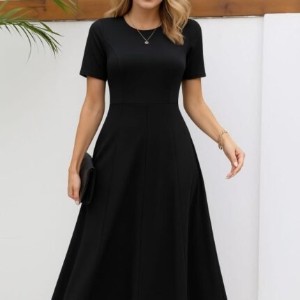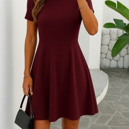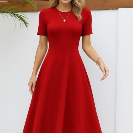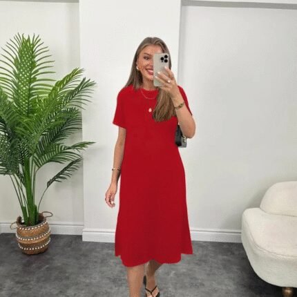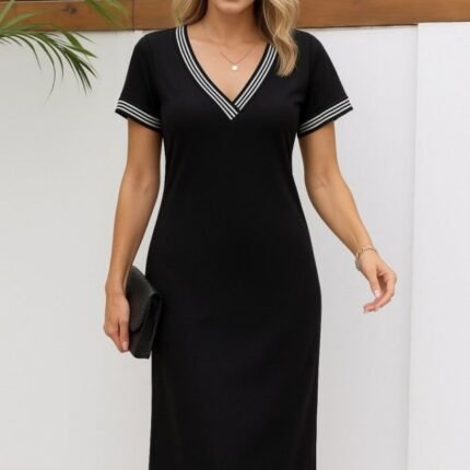 Kadın Kısa Kollu V Yaka Ve Yaka Ribana Detay Midiboy Viskon Elbise