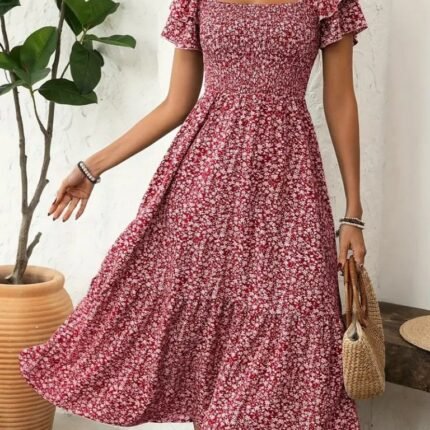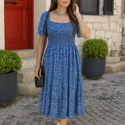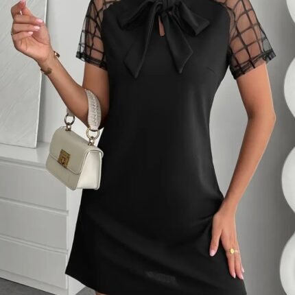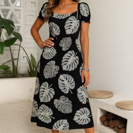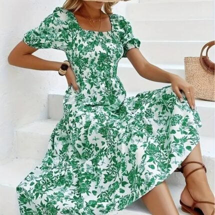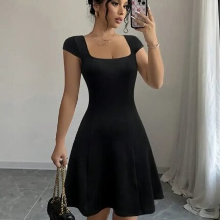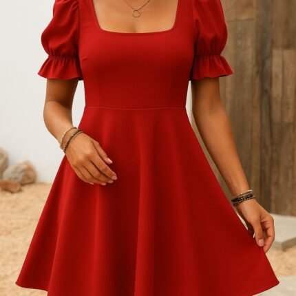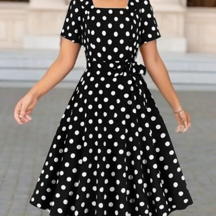 Kadın Kısa Kollu Kare Yakalı Bağcıklı Kaşkorse Elbise