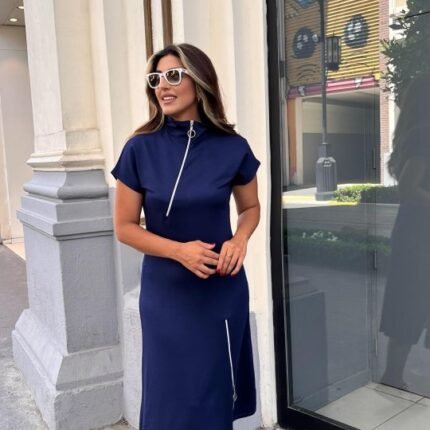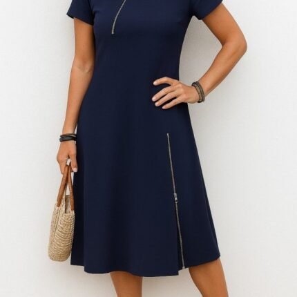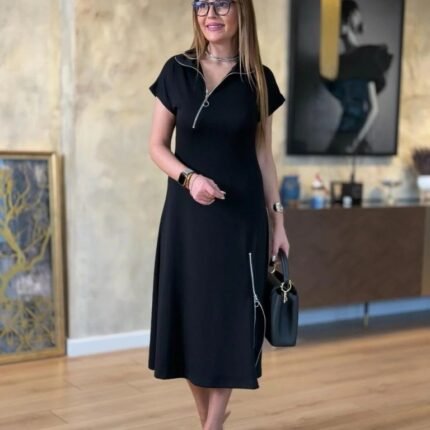 Kadın Kısa Kollu Yakadan Fermuarlı Cepli Yandan Yırtmaçlı Viskon Elbise