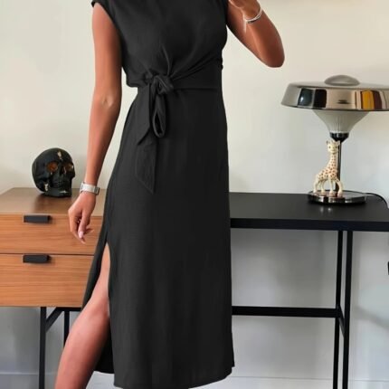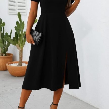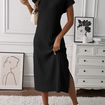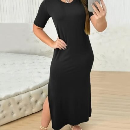 Kadın Kısa Kollu Bisiklet Yaka Yandan Yırtmaçlı Viskon Elbise