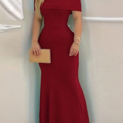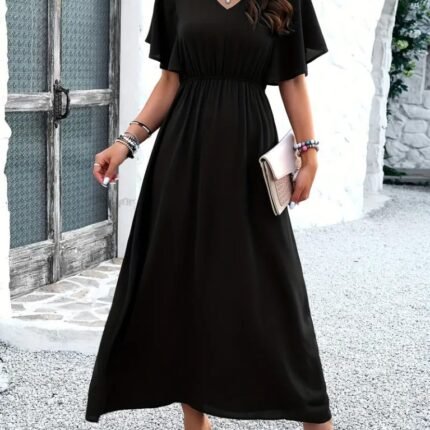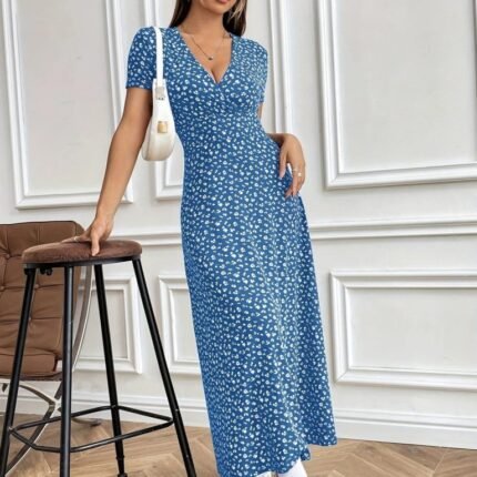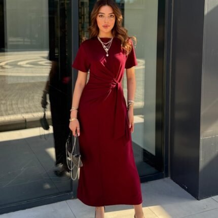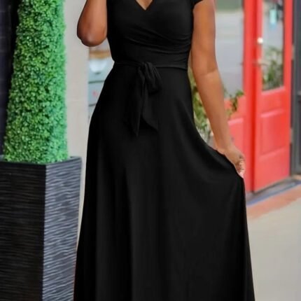 Kadın Kısa Kollu V Yakalı Belden Kuşaklı Maksi Boy Viskon Elbise