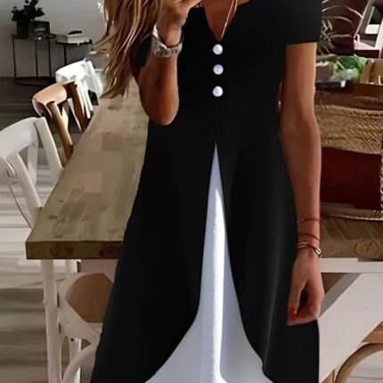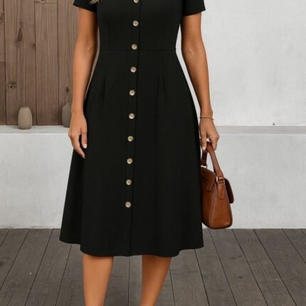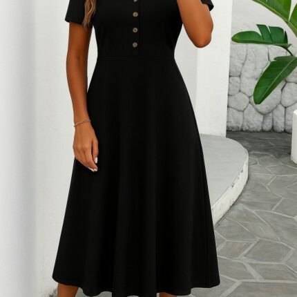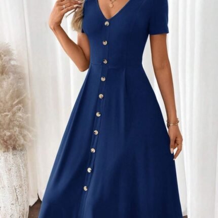 Kadın Kısa Kollu V Yaka önü Düğmeli Viskon Elbise