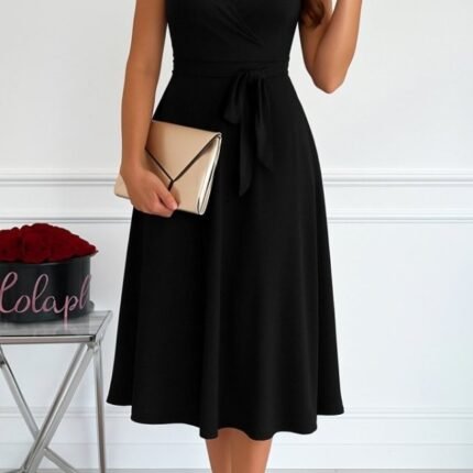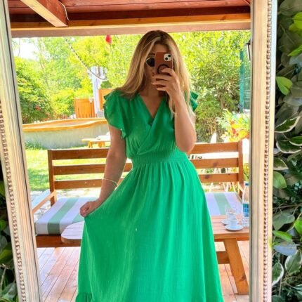 Kadın Kısa Kollu Kruvaze Yakalı Beli Lastikli Bürümcük Elbise