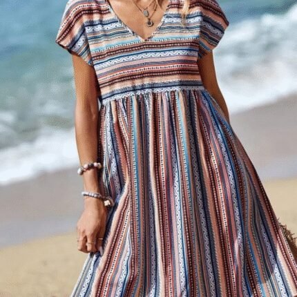 Kadın Kısa Kollu V Yakalı Etnik Desen şerit Detaylı Viskon Elbise