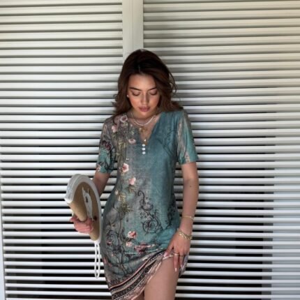 Kadın Kısa Kollu V Yakalı Desenli Yandan Yırtmaçlı Süprem Elbise
