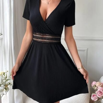 Kadın Kısa Kollu Dantel V Yakalı Desenli Süprem Elbise