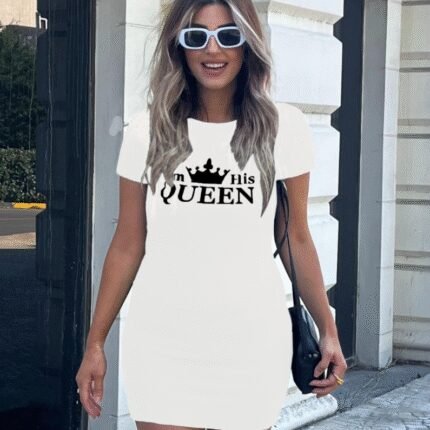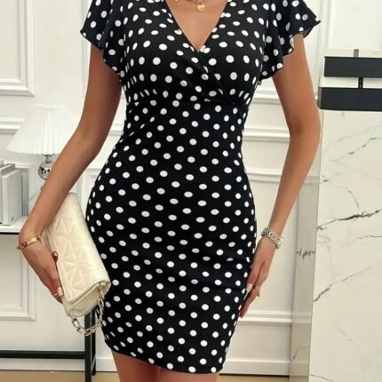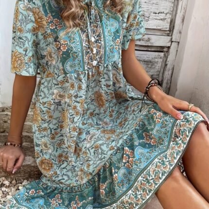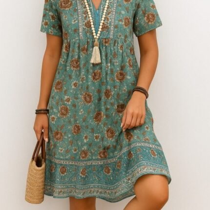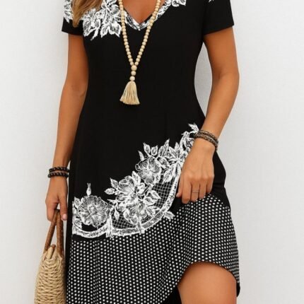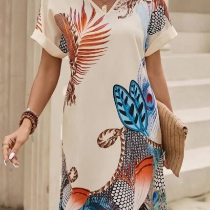 Kadın Kısa Kollu V Yakalı Desenli Süprem Elbise