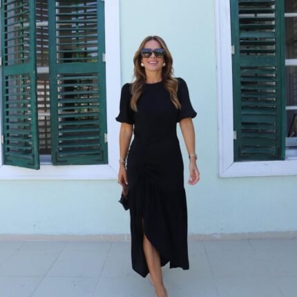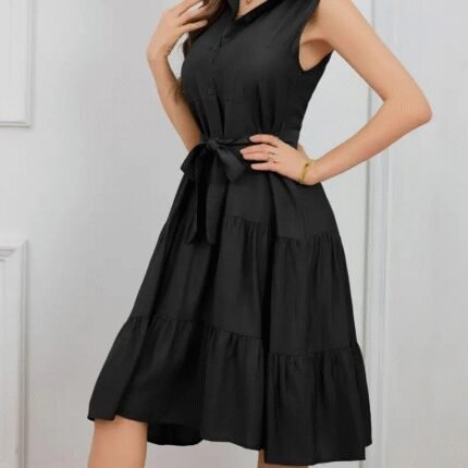 Kadın Kısa Kollu V Yakalı önden Fırfırlı Ithal Krep Elbise