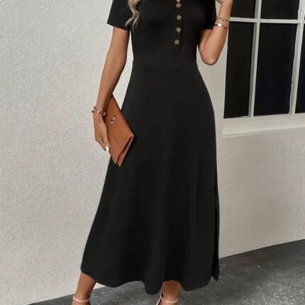 Kadın Kısa Kollu Bisiklet Yaka Yırtmaçlı Viskon Iki Iplik Elbise