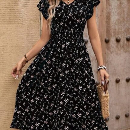 Kadın Kısa Kollu Kruvaze Yaka Beli Lastikli çiçek Desenli Elbise