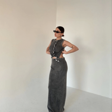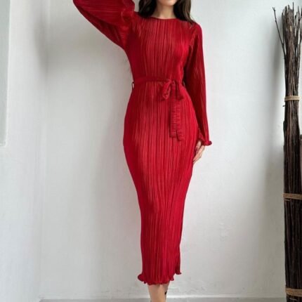 V YAKA BEL BONCUK BAĞLAMALI MÜSLİN ELBİSE YIRTMAÇ DETAYLI