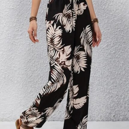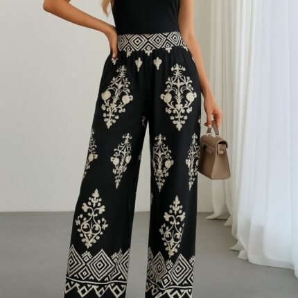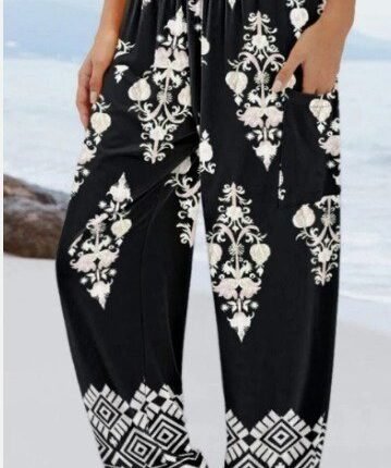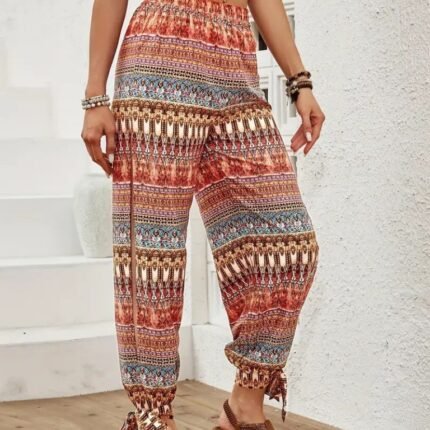 Kadın Yüksek Bel Büzgülü Etnik Desen Baskılı Süprem Pantolon