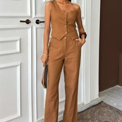 Kruvaze Model Klasik Pantolonlu Çupra Keten Takım 10191
