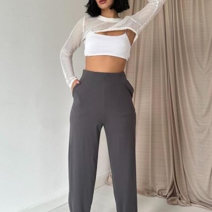 Bol Paça Yandan Fermuarlı Gri Kumaş Pantolon