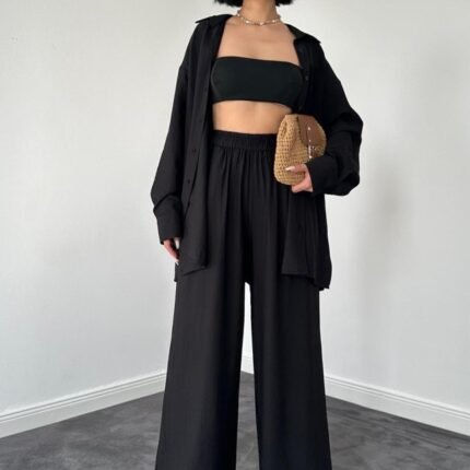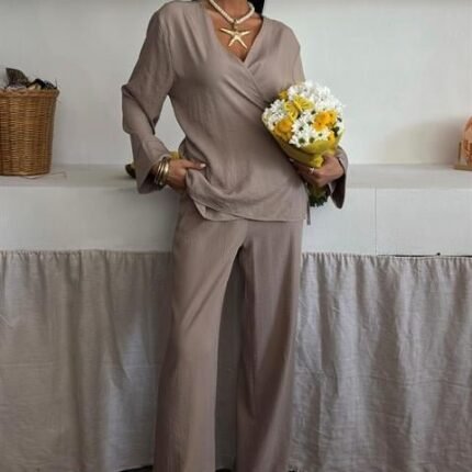 KETEN BELDEN BÜZGÜ DETAYLI GÖMLEK – PANTOLON TAKIM