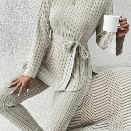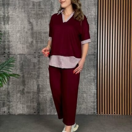 Kadın Modal Kumaş çizgili Gömlek Yaka Ikili Takım