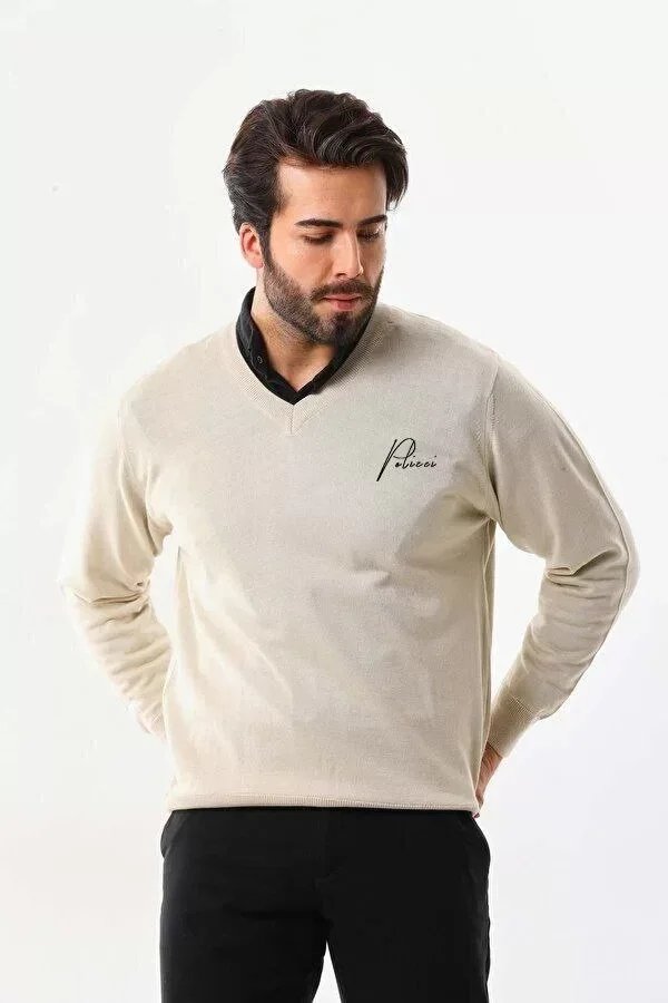 Baskılı V Yaka Uzun Kol Dokuma Triko – Bej