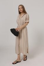 V YAKA BEL BONCUK BAĞLAMALI MÜSLİN ELBİSE YIRTMAÇ DETAYLI
