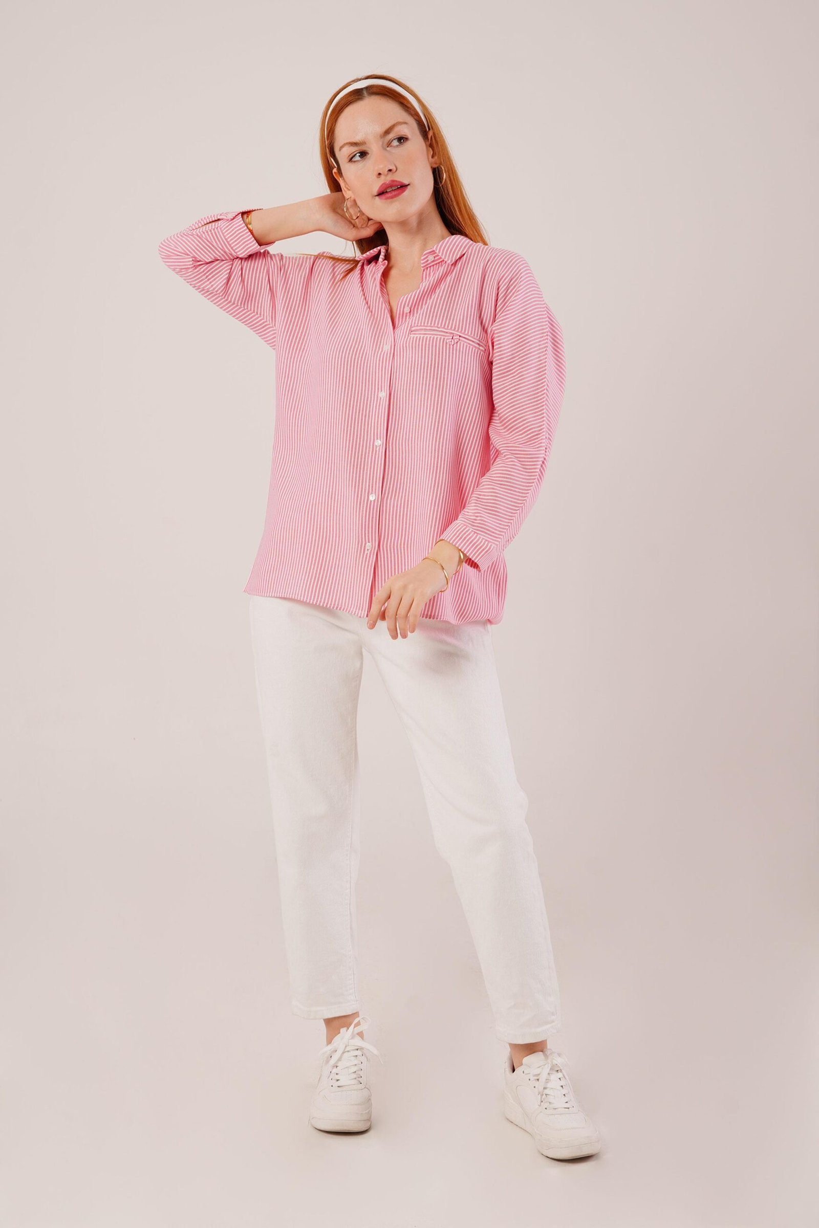 Cep Detay Çizgili Oversize Pembe Gömlek