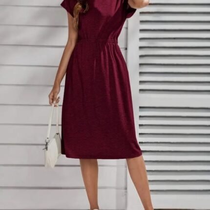 Kadın Kısa Kollu Bisiklet Yaka Belden Lastikli Midi Viskon Elbise
