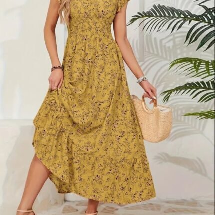 Kadın Kısa Kollu Kruvaze Yaka Beli Lastikli çiçek Desenli Elbise