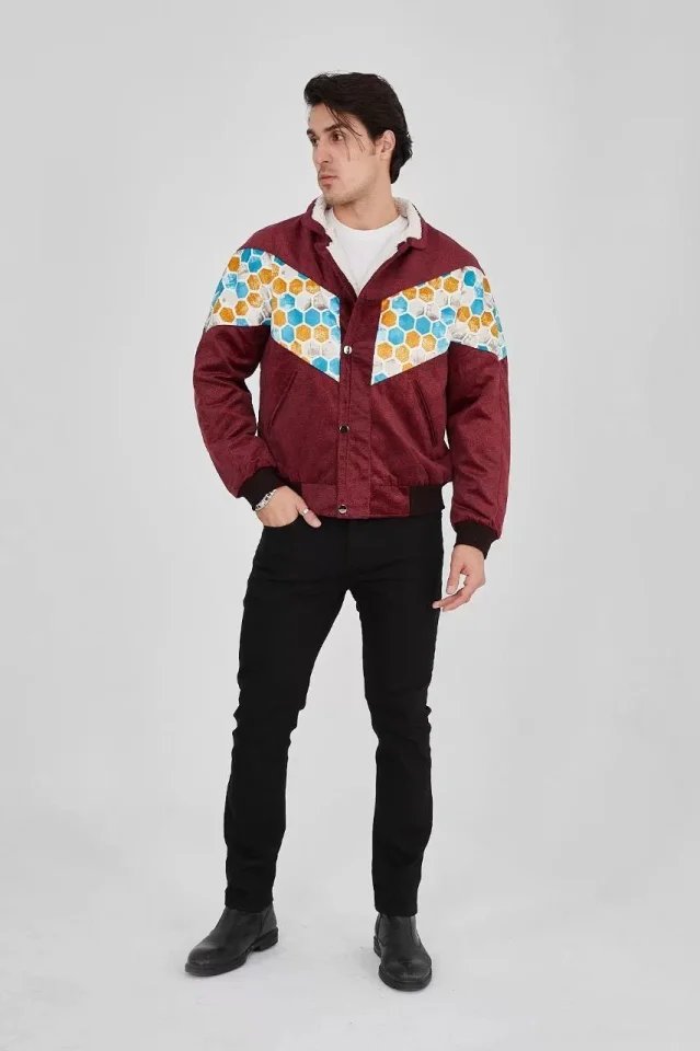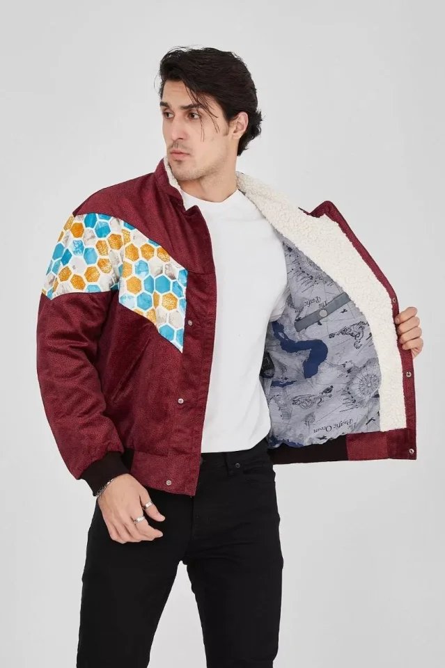 Erkek İçi Astarlı İçten Yaka Kısmı Peluşlu Beyaz Şeritli Vintage Ceket – Mürdüm