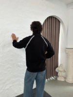 Erkek Oversize Dik Yaka Fermuarlı Sweatshirt – Zincir Nakışli Kanguru Cepli – Siyah