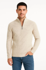 Erkek Yarım Fermuarlı Triko Kazak – Selanik Örgü, Dik Yaka, Pamuklu Dokuma, Regular Fit Uzun Kollu Kışlık Model – Bej