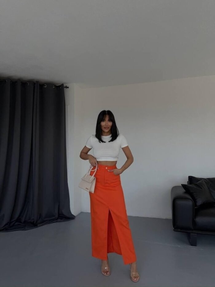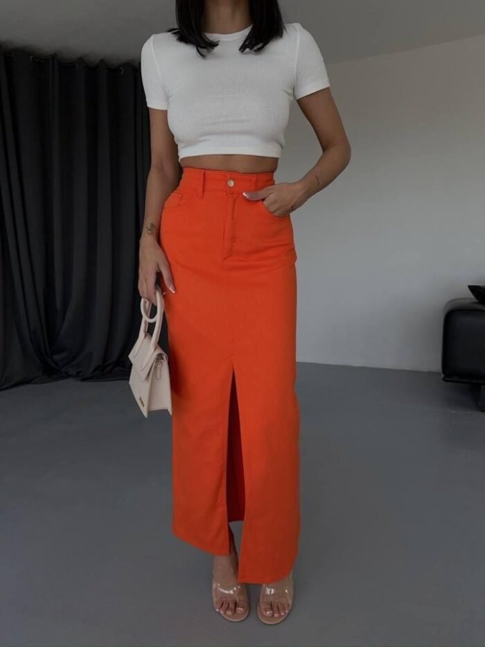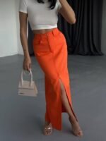 GABARDİN UZUN ÖNDEN YIRTMAÇLI ETEK – Turuncu