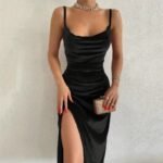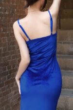 Kadın Askılı Degaje Yakalı Yırtmaçlı Kadife Midi Elbise