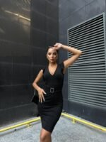 Kadın Derin V Dekolteli Omuzları Volan Detay Fırsat ürün Tokalı Elbise