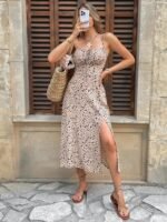 Kadın Ip Askılı Desenli Yırtmaçlı Süprem Midi Elbise