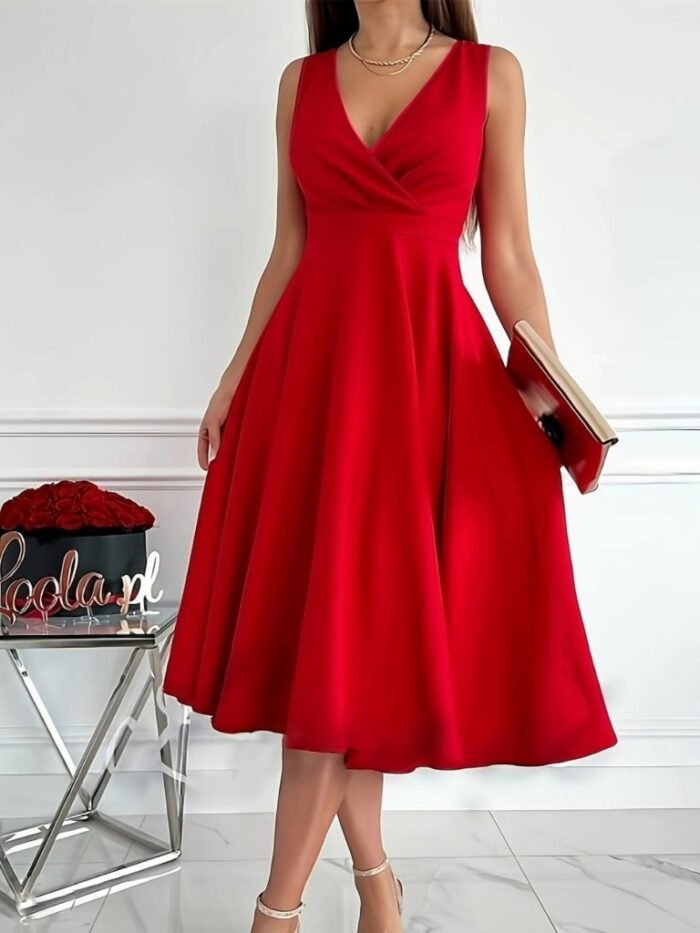 Kadın Ithal Krep Kumaş Kruvaze Yaka Eteği Kloş Kolsuz Mini Elbise