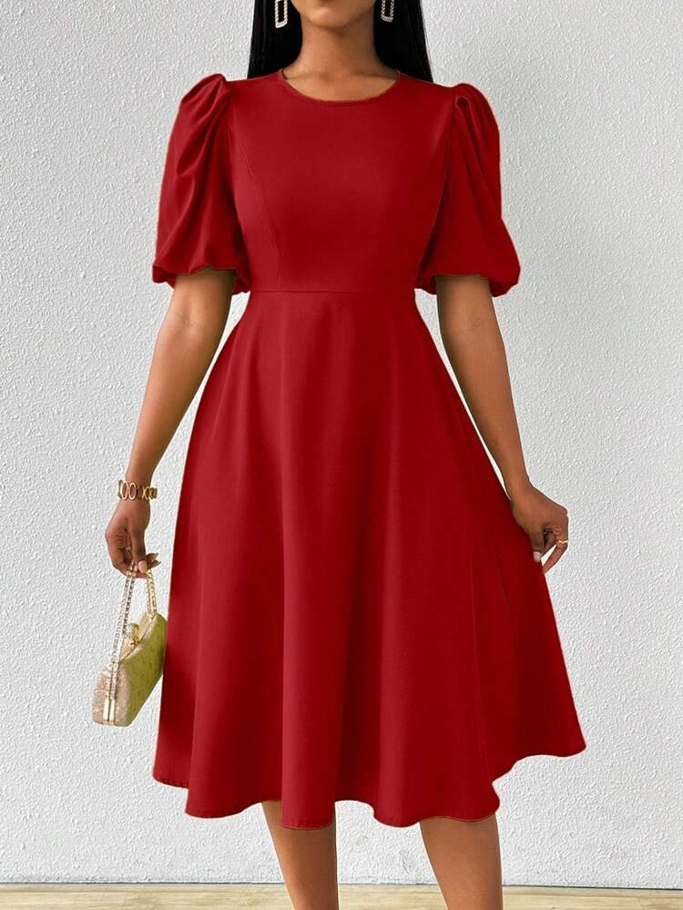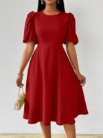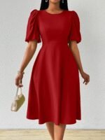 Kadın Kısa Kollu Bisiklet Yaka Belden Lastikli Midi Viskon Elbise
