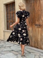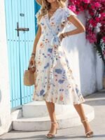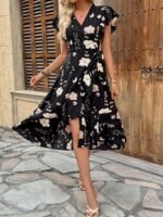 Kadın Kısa Kollu Kruvaze Yaka Beli Lastikli çiçek Desenli Elbise