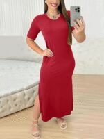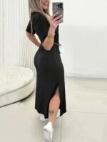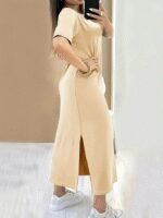 Kadın Kısa Kollu Bisiklet Yaka Yandan Yırtmaçlı Viskon Elbise