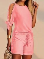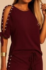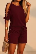 Kadın Kısa Kollu Bisiklet Yaka Yarı Açık Omuz Inci Detaylı Short T-shirt Viskon Ikili Takım