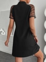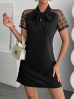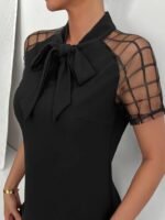 Kadın Kısa Kollu Boyundan Bağlamalı Omuzlarda Tül Detaylı Janjan Krep Elbise
