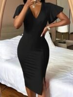 Kadın Kısa Kollu Derin Dekolte V Yakalı Yırtmaçlı Midi Janjan Krep Elbise
