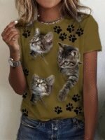 Kadın Kısa Kollu Kedi Ve Pati Baskılı Süprem T-shirt