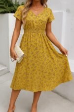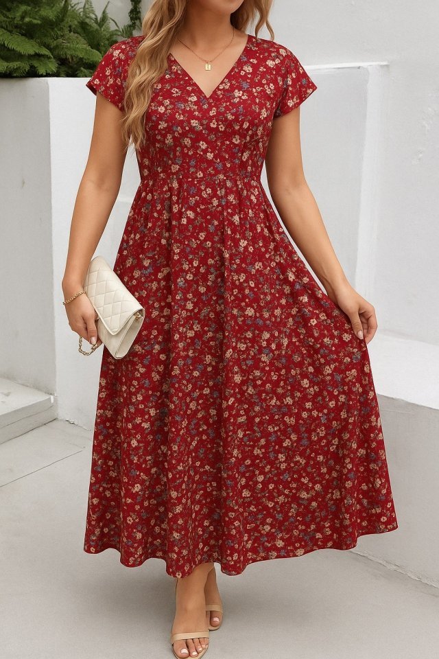 Kadın Kısa Kollu Kruvaze Yaka Beli Lastikli çiçek Desenli Elbise