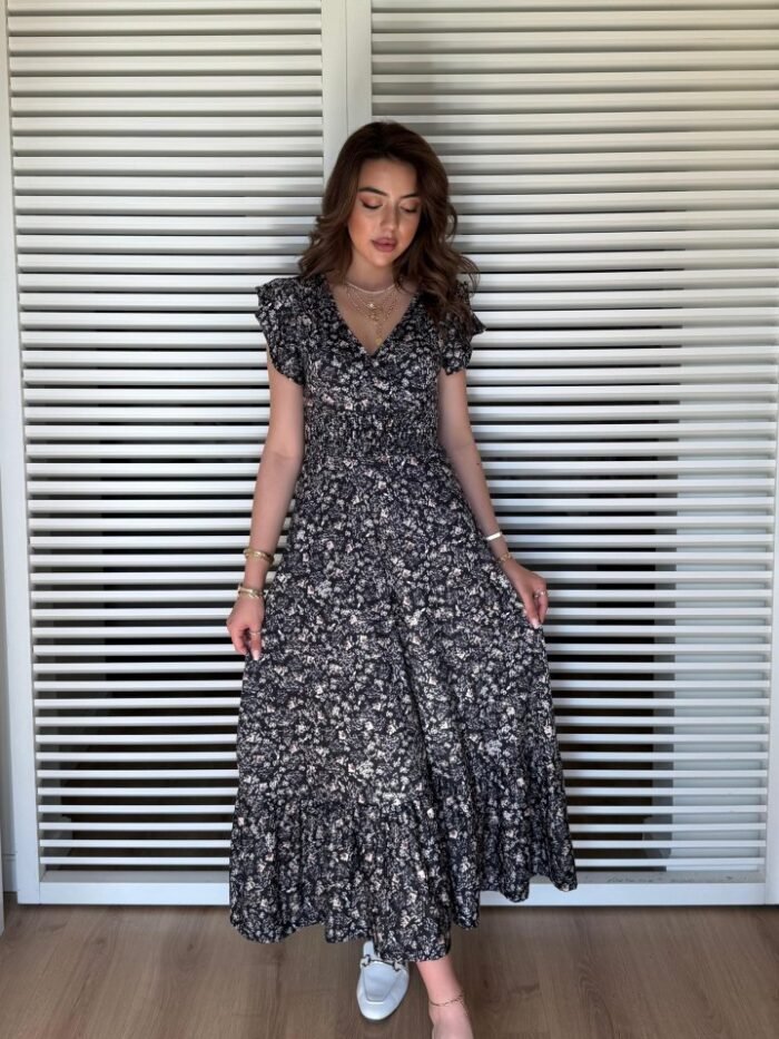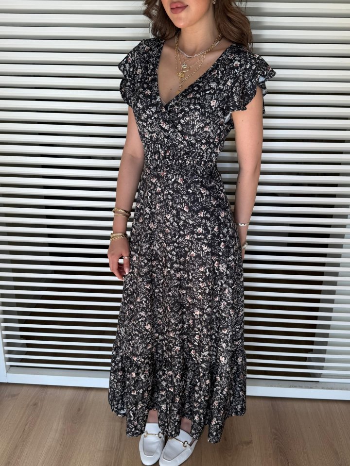 Kadın Kısa Kollu Kruvaze Yaka Beli Lastikli çiçek Desenli Elbise