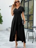 Kadın Kısa Kollu Kruvaze Yakalı önden Volanlı çapraz Kesim Detaylı Maksi Boy Ithal Krep Elbise