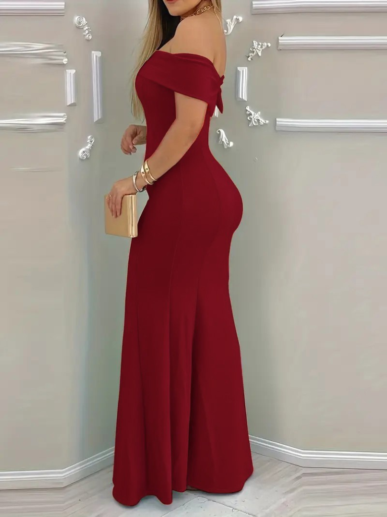 Kadın Kısa Kollu Madonna Yaka Belden Oturtmalı Uzun Ithal Krep Elbise