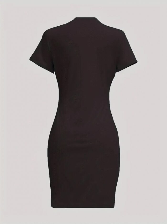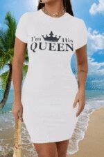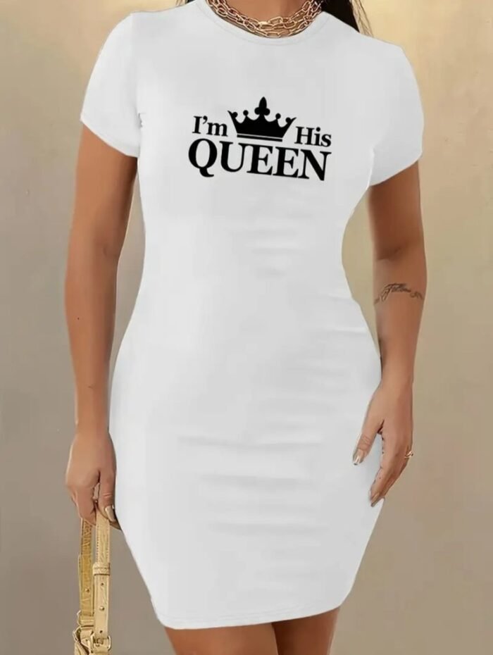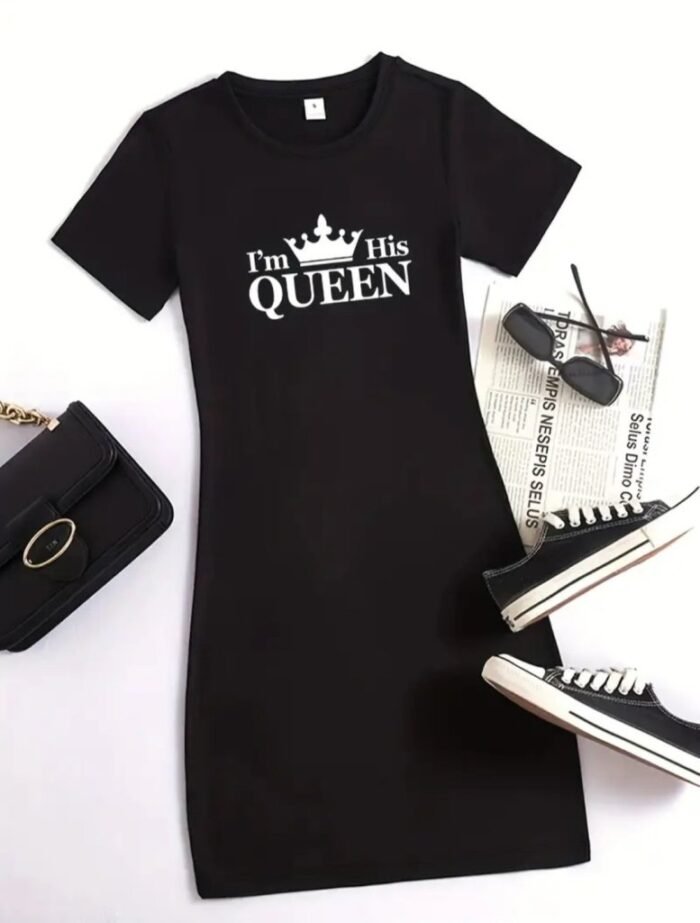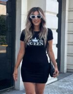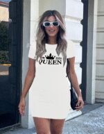 Kadın Kısa Kollu Queen Baskı Iki Iplik Mini Elbise